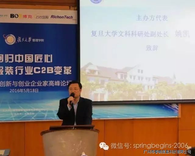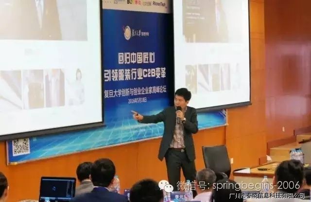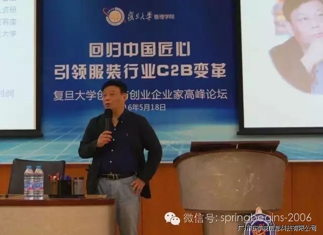 5月18日下午13:00,万众期待的“引领服装行业C2B变革,创新与创业企业家高峰论坛”在复旦大学管理学院如期召开并于下午17:30完美落幕,本次论坛由复旦大学管理学院主办、广州888官网集团信息科技有限公司协助举办,会场内座无虚席,200余人到场参会。论坛邀请了多位资深学者、成功企业家等重磅嘉宾纯干货主题演讲,受到广泛好评,会议进行中掌声持续响起。
