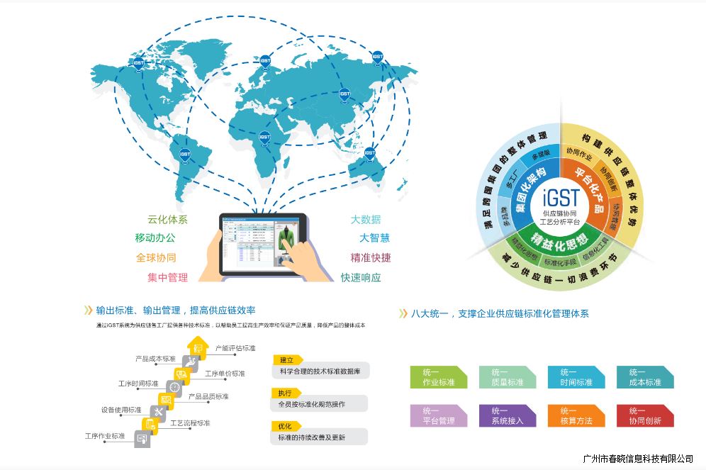 通过888官网集团iGST标准化协同管理平台,特步供应链管理部门协调内部外部信息,让供应链的每一个参与者都能清晰了解并掌握生产工艺、品质要求、工艺流程、作业方法、作业时间、作业成本、生产计划、订单负荷、人机需求等标准化数据、从而达到统一标准、统一规范化的管理。